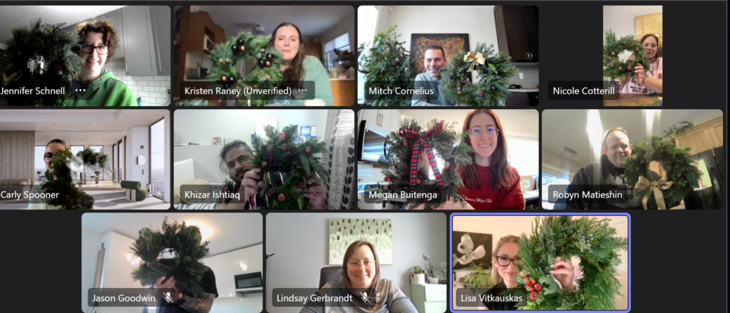 Have a team that’s all spread out? We can do a virtual class. I’ll send you a project package in advance to mail to your out-of-town members, and we can do the class on your favourite platform. This project is only available in November/December for wreaths and centrepieces.