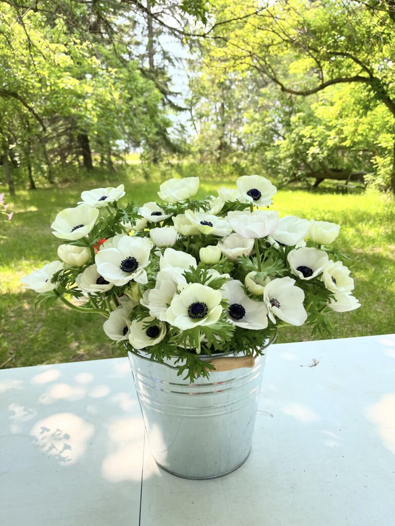 This picture doesn’t do the anemone patch justice, but these flowers are a sight to behold! I grow mainly white anemones with black centres, and as long as the weather cooperates, these beauties will be in bridal and CSA bouquets from early to late June.