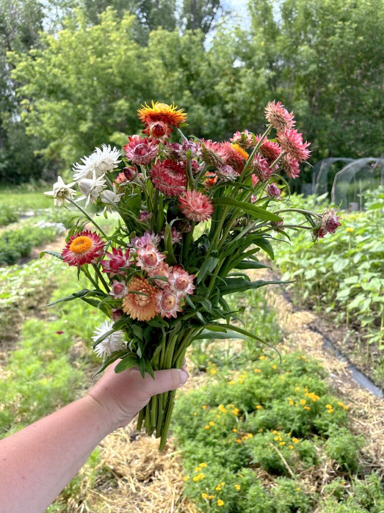 A full 40-foot row of strawflowers wasn’t quite enough this year to supply all my needs for pumpkin and wreath sales, so 2 40-foot rows it will be! I love strawflowers because they are so versatile and long-lasting. It’s also fun to touch their petals and make a sound with them.